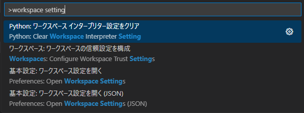 基本設定: ワークスペース設定を開く(JSON)を選択し、Python の実行パスを追記。